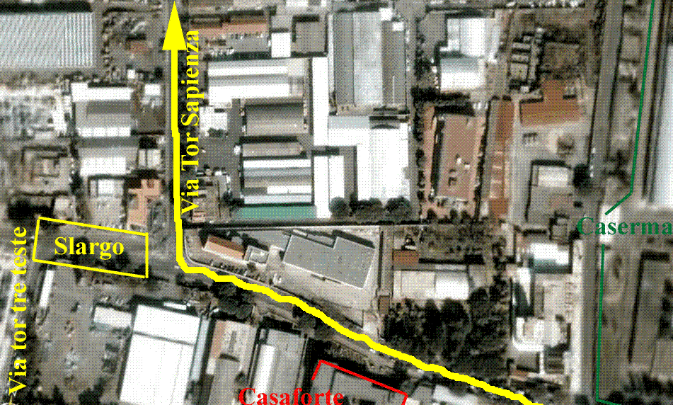 Passato Casaforte girate a Destra su via Tor SapienzaFinito il muro di cinta della caserma dopo pochi metri c'è Casaforte sul lato opposto che è illuminato anche di sera, girate subito dopo a destra senza passare per lo slargo che fa da incrocio con via Tor Tre Teste. |