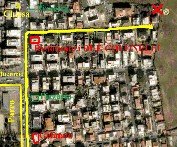 Dopo il secondo semaforo e l'incrocio, girate a destra e andate in fondo alla via.Il secondo semaforo pedonale si trova appena prima dell'incrocio davanti al parco; davanti al parco vedrete il gelataio, una pizzeria. Passato l'incrocio sulla destra ci sono dei portici ed il ristorante I DUE COLONNELLI, girate a destra subito dopo il ristorante ed andate infondo alla via. |