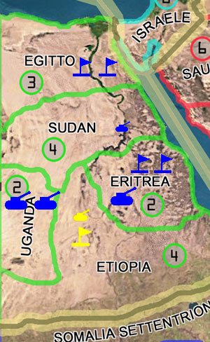I blu hanno conquistato l'etiopia ed avanzano con l'unità di attacco. Finito il turno usano come spostamento finale le due bandiere dell'Eritrea. I Blu potrebbero ricevere un attacco da un nemico del settore Equatoriale che teme la loro unità di attacco, ma l'Etiopia è molto difficile da prendere: ci vorranno almeno 3 unità di attacco, ma con tre unità di attacco si può fare un attacco atomico.