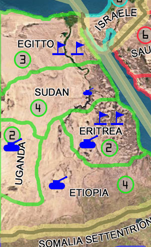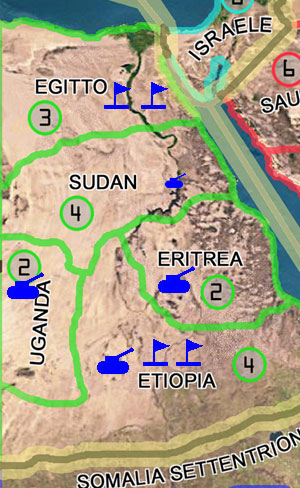 Questo esempio mostro che però i BLU non sono in grado di fare ciò: Possono eleggere l'Eritrea come territorio di arrivo e difesa, ma l'Egitto non può avere una sola bandiera perchè si dovrà difendere. I blu quindi applicheranno questa tattica: due attacchi convenzionale al Sudan ed all'Uganda, e un attacco con armate di attacco in Etiopia.